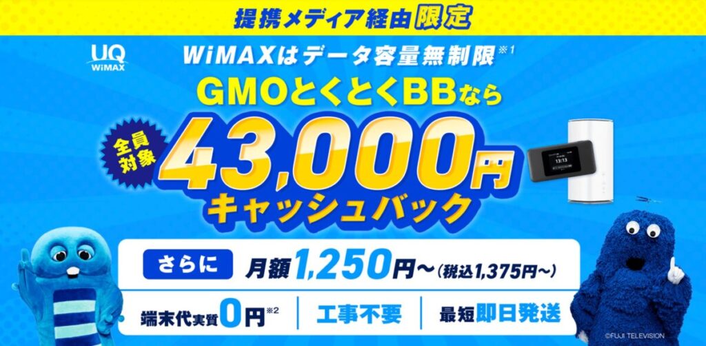 またWiMAXに加入するだで43,000円のキャシュバック、さらに他社乗り換え時に解約金等があれば最大40,000円還元があり、端末代金も実質無料となります。