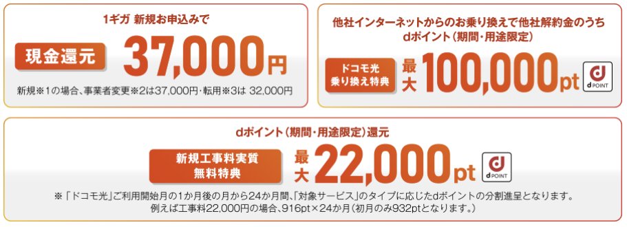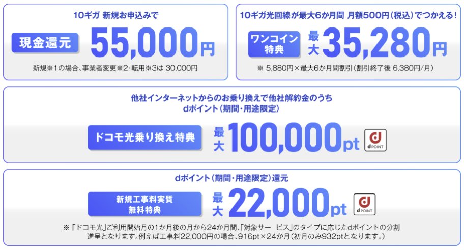 ドコモ光はキャンペーン特典が充実しており、現在以下の特典が用意されています。