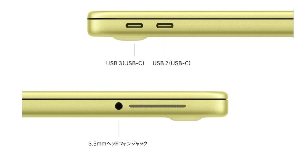 MacBook NeoはUSB-Cポートを2つ搭載していますが、Thunderboltには非対応です。さらに2つのポートはそれぞれUSB 3.0と2.0と規格が異なり、外部モニターへの映像出力に対応しているのはUSB 3.0側の1ポートのみという制限があります。