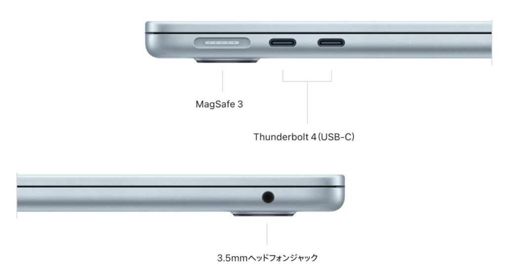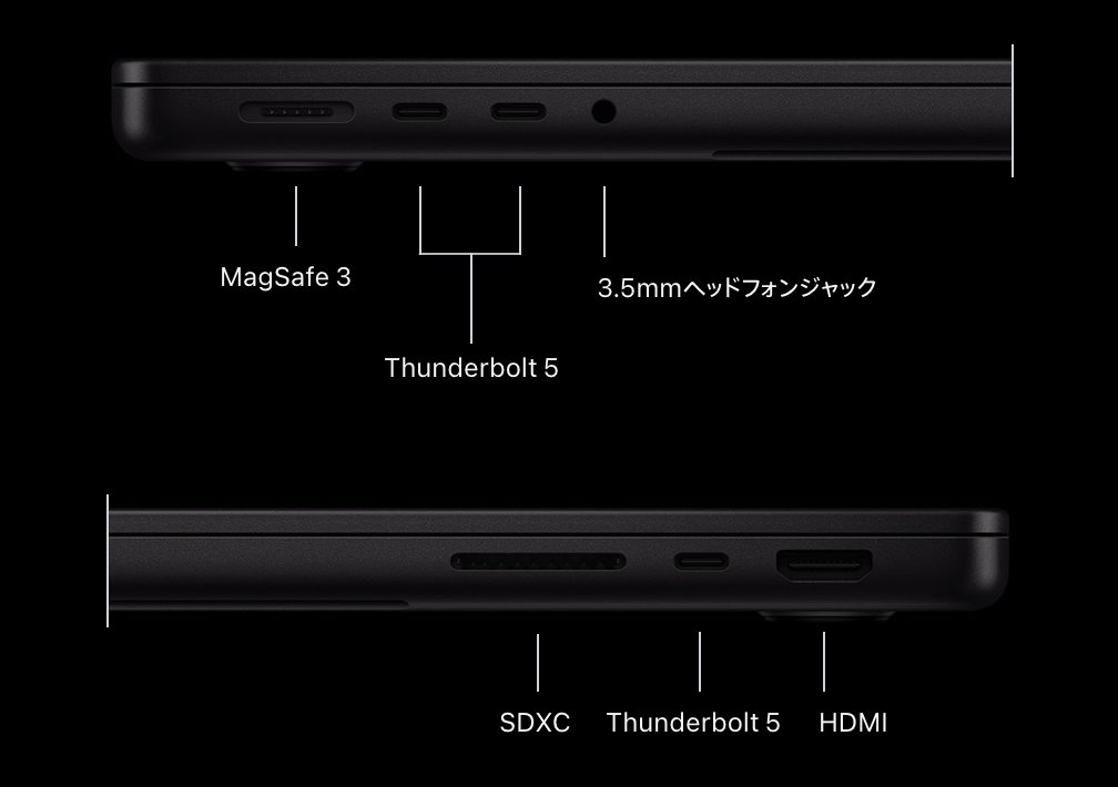 | 外部ポート | USB 3(USB-C) USB 2(USB-C) | Thunderbolt 4×2 イヤホンジャック | Thunderbolt 4×2 イヤホンジャック | Thunderbolt 5×3 (M5 Pro/M5 Max) Thunderbolt 4×2 (M5) HDMI SDXCカードスロット イヤホンジャック | Thunderbolt 5×3 HDMI SDXCカードスロット イヤホンジャック |