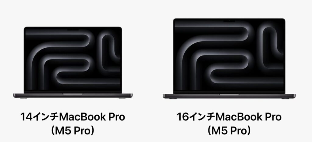 同じM5 Pro / M5 Maxチップを搭載しながら、14インチ(1.60kg)は携帯性を重視するプロ向け、16インチ(重量2kg超)は大画面での作業効率を最優先するヘビーユーザー向けと棲み分けられています。