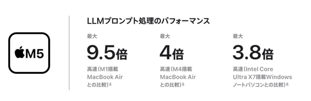 M5チップのAI処理能力は前世代から大きく進化しています。M1搭載MacBook Airと比べて大規模言語モデル(LLM)の処理性能が9.5倍に向上し、Intel Core Ultra X7搭載のWindowsノートPCと比べても3.8倍の処理性能 GIGAZINEを実現しています。