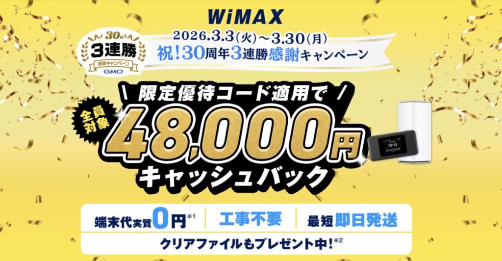 さらに今なら加入するだけで48,000円のキャッシュバック(3/30まで限定)、他社からの乗り換えで解約金がある場合は最大40,000円の還元も受けられます。端末代金も実質無料です。