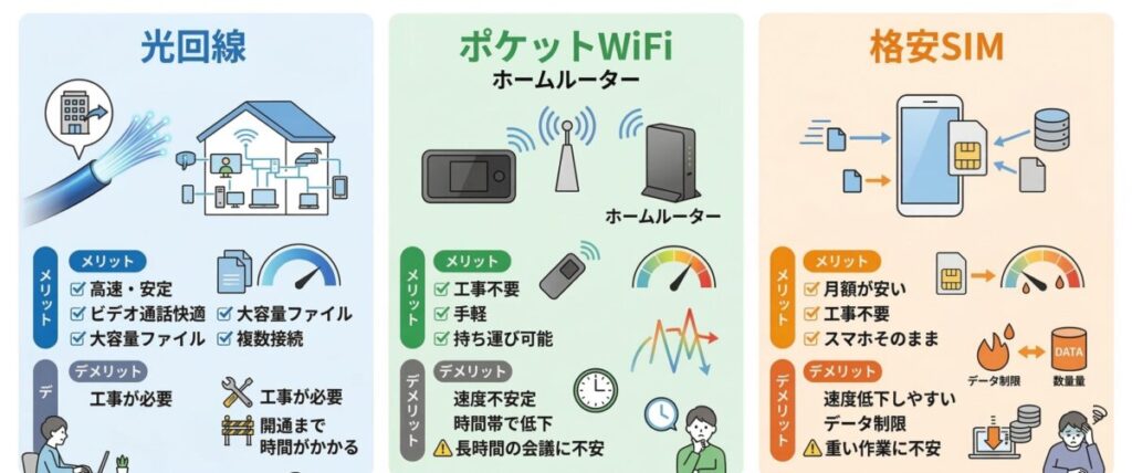 ポケットWiFiや格安SIMは工事不要で手軽に始められる反面、時間帯によって速度が低下しやすく、長時間のオンライン会議や大容量ファイルのやり取りには不安が残ります。